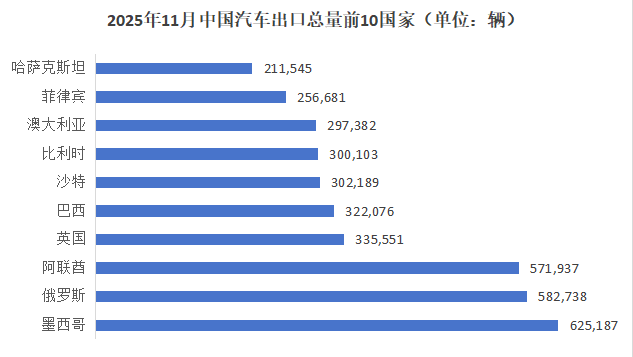 近年来,中国汽车出口规模与效益实现快速增长。2025年1-12月,我国汽车出口总量达832万辆,同比增长30%,其中新能源汽车出口343万辆,同比大幅增长70%,增速显著高于去年同期水平。整车出口市场呈现多元化格局,墨西哥、俄罗斯、阿联酋、巴西、英国等位居前列,阿联酋、墨西哥、澳大利亚、阿尔及利亚、英国等市场增量尤为显著。