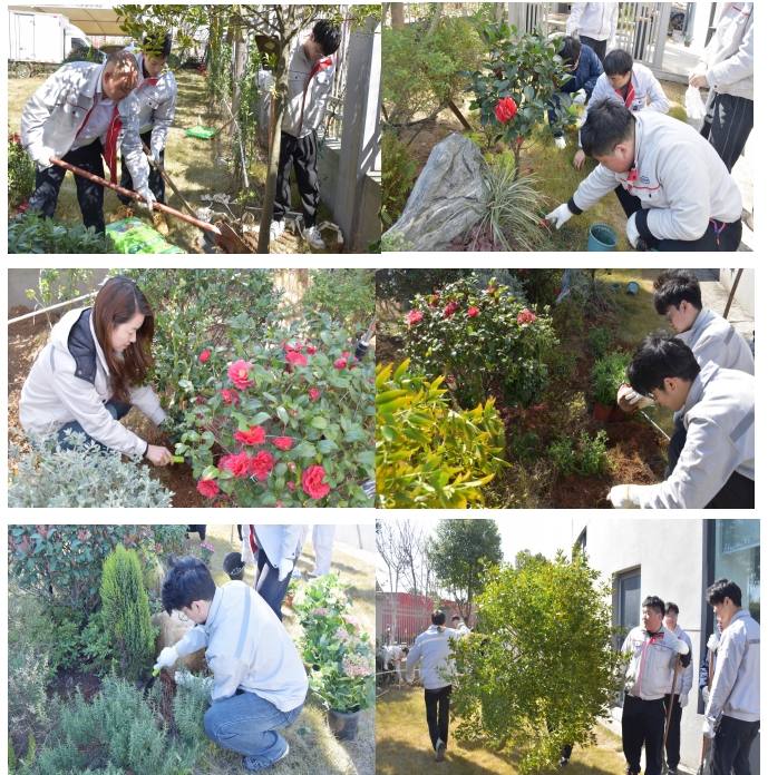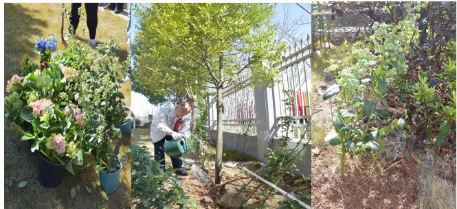 在专业园艺师的指导下,在领导的带领下大家分组协作、挥锹培 土,精心栽植黄金香柳、绣球、玛格丽特等观赏花卉,并种下寓意丰 收的蓝莓果苗。每一株苗木的落土,都寄托着对绿色家园的美好期许; 每一次默契配合 ,都凝聚着团队的向心力。