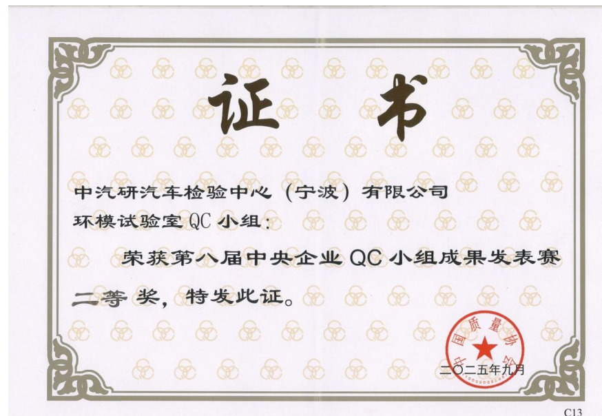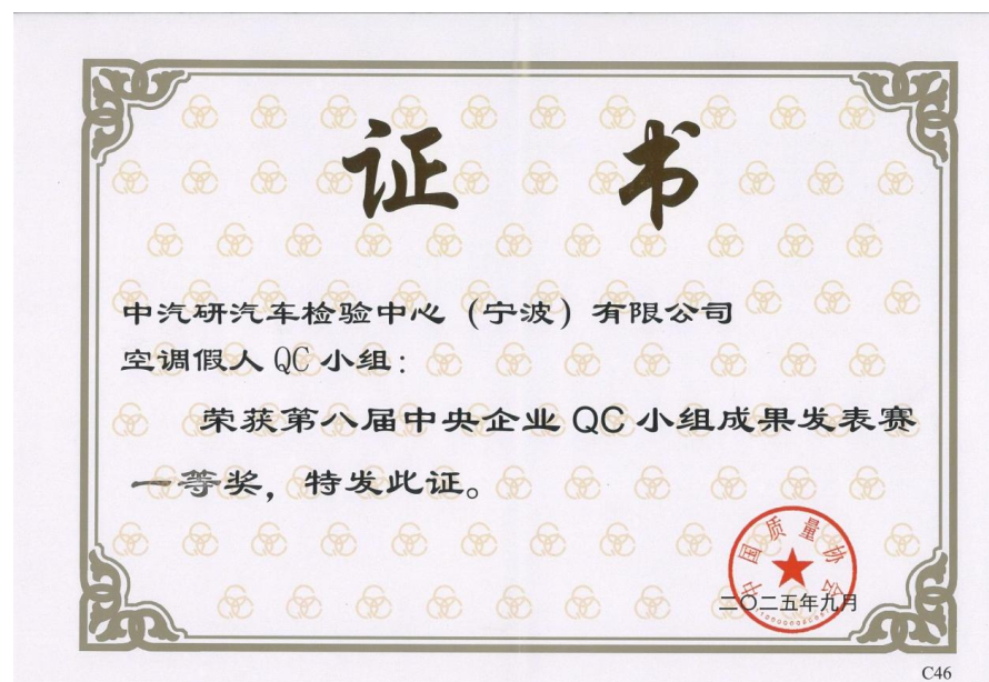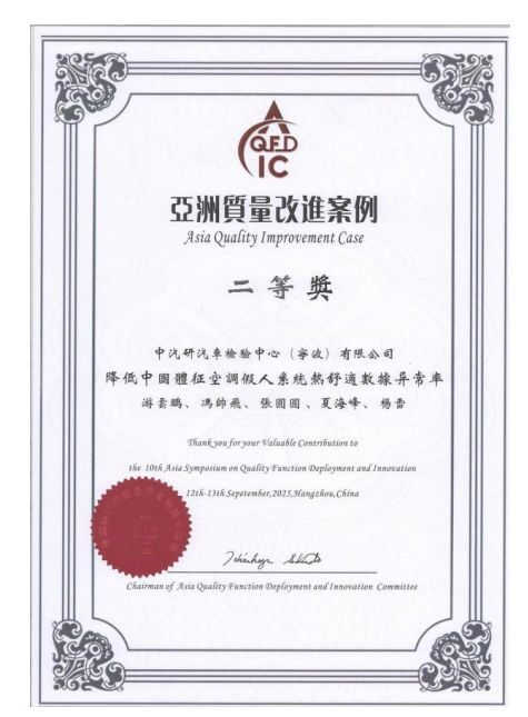 中央企业QC小组成果发表赛系国内质量领域最具权威性与影响力的赛事之一,汇聚各大中央企业优秀质量管理小组,集中展示其在推进质量提升、突破技术瓶颈、降低成本提高效益、优化管理流程等方面的先进经验与创新成果,充分彰显中央企业在质量强国建设中的引领作用与责任担当。 亚洲质量功能展开协会(简称AQFDA)成立于2016年,旨在亚洲范围内传播QFD先进理念并推广最新研究成果。目前该协会已成为具有全球影响力的最大规模QFD交流平台。 宁波检验中心始终将质量管理视为企业发展的“生命线”,积极营造“人人参与改进,事事追求提高”的质量文化氛围,自2023年以来注册备案6个QC小组,并严格遵循《质量管理小组活动准则》、《质量管理小组活动推进指南》开展QC小组活动。“空调假人QC小组”自成立以来始终深耕在科研创新一线,持续开展质量改进活动,充分运用质量工具,聚焦课题症结问题,找准主要原因,制定并落实改进措施,显著提高中国体征空调假人系统热舒适测评准确度,为座舱热舒适性测试提供了更加精准可靠的工具;“环模试验室QC小组”自成立以来连续两年代表中汽中心参加中央企业QC小组发表赛活动,为解决客户的困扰,提升服务质量,QC小组有效应用质量工具使环模试验室试验有效通过率显著提高,极大地提升了检测质量和服务水平。 下一步,宁波检验中心将持续深化质量管理创新实践,加快推进质量改进与技术创新,以质量根基筑牢企业发展基石,为“十四五”收官之年注入焕新动力,奋力书写“十五五”新篇章。