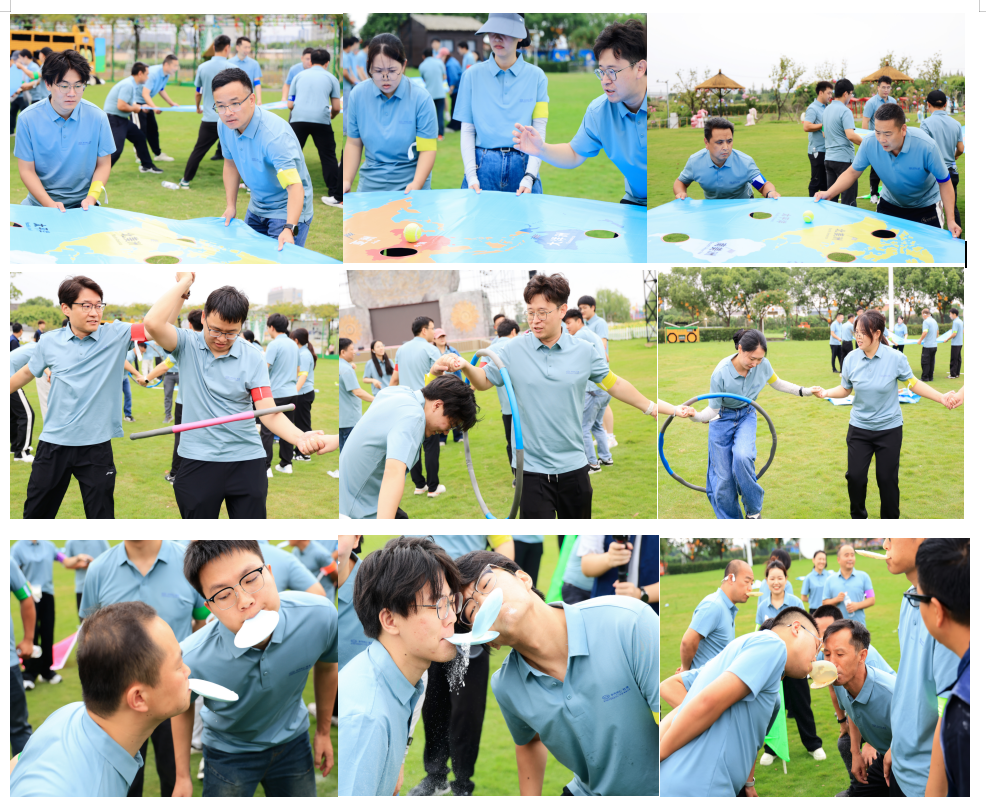 活动伊始,在清新的草坪上,有趣的破冰游戏迅速点燃了全场热情。各组队员通力协作,共同设计队旗、喊响口号。最终,九支队伍闪亮登场,个个精神抖擞、创意十足,充分展现了凝聚力和昂扬斗志。随后,“环游世界球”、“一圈到底”、“面粉传递”等团队拓展项目依次展开。这些项目不仅考验个人的灵活应变能力,更锤炼了团队的默契与协作精神。草坪上欢声笑语此起彼伏,大家在愉快的合作中增进了默契,团队士气也愈发高昂。